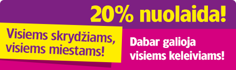 > 20% Wizzair nuolaida taikoma tarifui, įskaitant mokesčius ir mažą saloninį krepšį (maksimalūs išmatavimai 42x32x25);